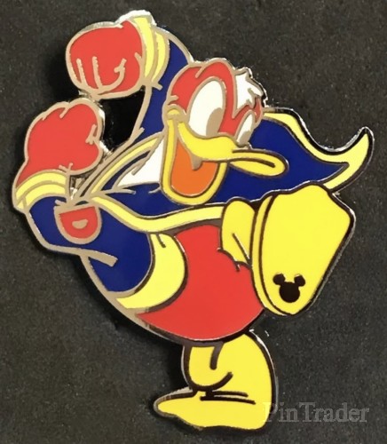 | Donald Duck is dressed in a red and blue superhero outfit with a red cape and mask. |
