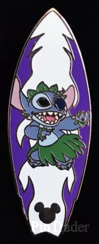 | This pin features Stitch on a purple and white surfboard. |
