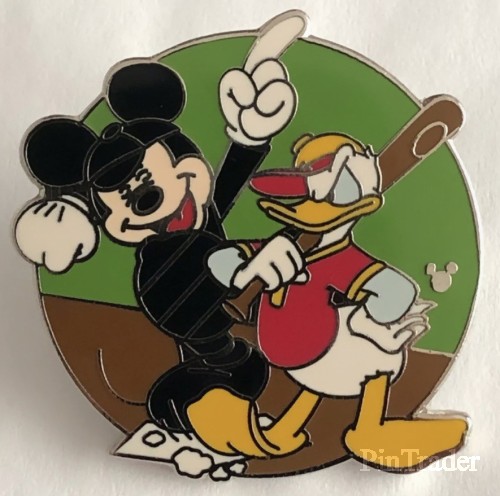 | Donald holds the bat while Mickey stands behind him as an umpire. |