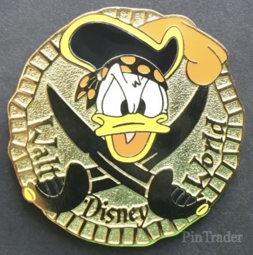 | This pin has Donald's head on a gold pirate doubloon (coin). There are 2 swords crossed underneath him. The words Walt Disney World are around the swords. Pin 2 of 4 in the series. |