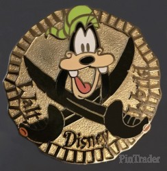 | This pin has Goofy's head on a gold pirate doubloon (coin). There are 2 swords crossed underneath him. The words Walt Disney World are around the swords. Pin 3 of 4 in the series. |