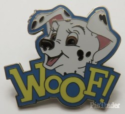 | This pin has a head shot of a Dalmatian puppy from "101 Dalmatians" with a blue background. The letters Ruff are yellow in color. Pin 3 of 3 in the series. |