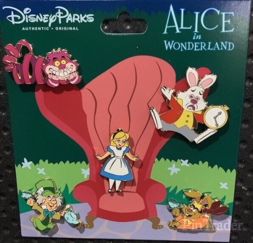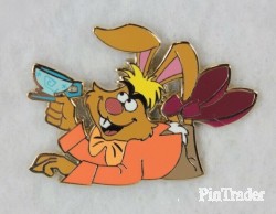 | 5 pins in the set. The March Hare is lying down, on his belly, with a tea cup in his right hand, outstretched, possibly to catch the tea that is pouring from the Mad Hatter's tea pot. |