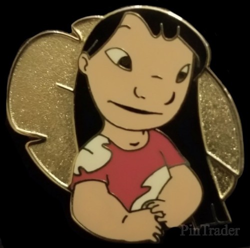 | This pin has Lilo from "Lilo & Stitch" in front of a gold leaf. |