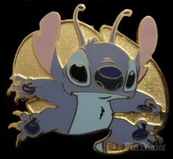 | This pin has Stitch from "Lilo & Stitch" in front of a gold leaf. |