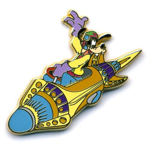 | Goofy is riding one of the rockets from Disneyland Paris's Orbitron. This pin could be purchased in DLP's Discoveryland. The reverse has "Disneyland Resort Paris" and "©Disney" on it. |