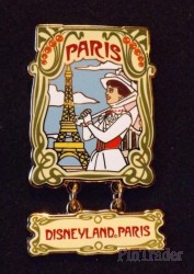 | Mary Poppins is wearing her white dress and holding a parasol. She is standing near the Eiffel Tower. |