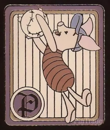 | This pin has Piglet on a baseball card catching a baseball. There is a letter P in the lower left corner of the pin. |