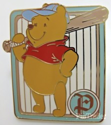 | This pin has Winnie the Pooh on a baseball card holding a bat. There is a letter P in the lower right corner of the pin. |
