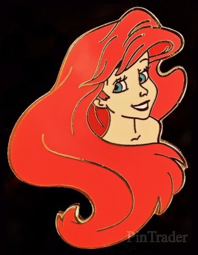 | This pin features Ariel from The Little Mermaid looking to the right with her red hair around her. |