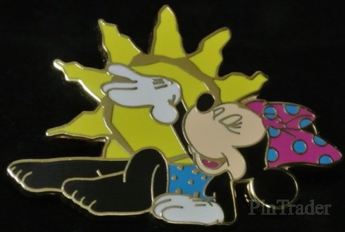 | This pin has Minnie Mouse laying in the sun wearing a blue bathing suit with polka dots. She is also wearing a pink and blue polka dot bow. Pin 3 of 5 in the series. |