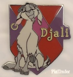 | This pin is Djali, Esmeralda's pet goat from the Movie "Hunchback of Notre Dame". He is sitting in front of purple and red diamond pattern. He is looking straight forward with a earring in his right ear. His name is to the left of him. Pin 1 of 4 in the series. |