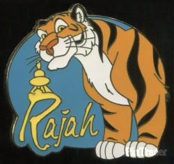 | This pin is Rajah from the movie "Aladdin". Rajah is standing in a blue background with his name in yellow to the left of him. Pin 3 of 4 in the series. |