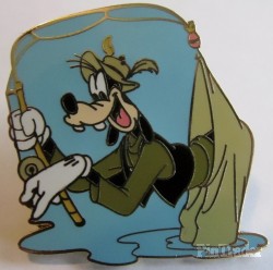 | Goofy is in the water holding a fishing pole that is hooked to the back of his pants. |