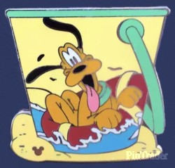 | Pluto rides in a red innertube on the side of a yellow bucket with a green handle. Sand runs around the bottom of the bucket. |
