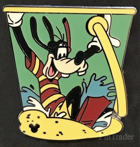 | Goofy jumps into the water on the side of a green bucket with a yellow handle. Sand runs around the bottom of the bucket. |