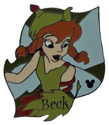 | Beck looks down to her left on this dark green leaf shaped pin. Her name is printed at the bottom on a green leaf. |