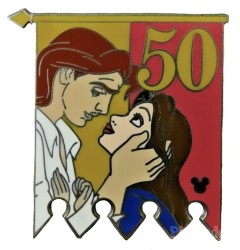 | This pin depicts Belle and the Beast (Adam), from Beauty and the Beast, and has a hidden Mickey icon in the lower right, plus a gold 50 in the top right. |