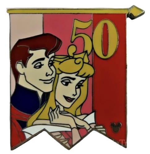 | This pin depicts Aurora and Phillip, from Sleeping Beauty, and has a hidden Mickey icon in the lower right, plus a gold 50 in the top right. |