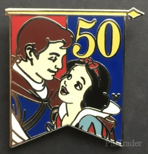 | This pin depicts Snow White and her prince, and has a hidden Mickey icon in the lower right, plus a gold 50 in the top right. |
