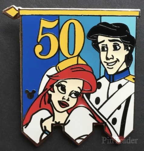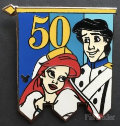 | This pin depicts Ariel and Eric, from The Little Mermaid, and has a hidden Mickey icon in the lower left, plus a gold 50 in the top left. |