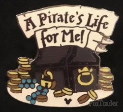 | Pin includes a treasure chest with coins sitting around it and a banner at the top that says: A Pirate's Life for Me! |
