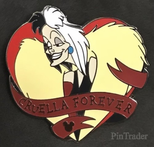| Cruella De Vil, from 101 Dalmatians, poses with her furs around her in a heart shape. A red banner runs across her chest reading Cruella Forever. |