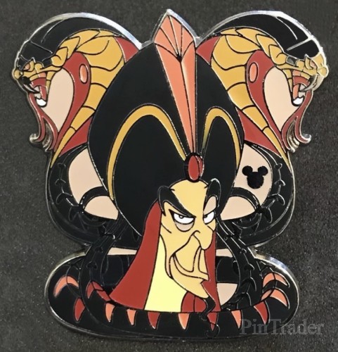 | Jafar, from Aladdin, poses with two black, red, and yellow cobra snakes wrapped around him and extending from the top. |