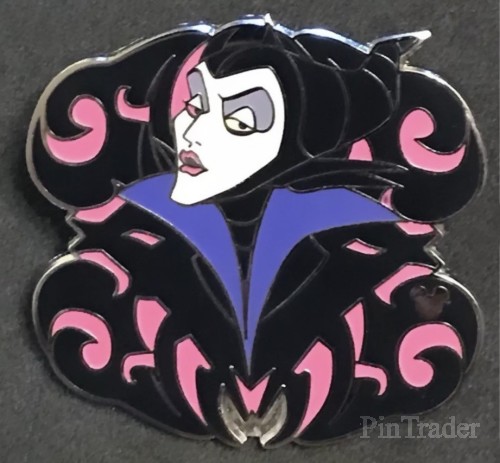 | Maleficent, from Sleeping Beauty, poses in front of a pink and black background. |