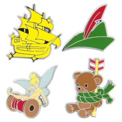| Shop Disney Description: Peter Pan Pin Trading Flair Set Item No. 7511057371145P Spirits soar with four cloisonné designs to delight collectors of this Peter Pan Disney Pin Trading Flair Set, directly from Never Land. Magic in the details • Created especially for Walt Disney World Resort and Disneyland Resort • Set of four pins on card • Includes Tinker Bell, Peter Pan hat, Michael Darling's teddy bear, and pixie-dusted pirate ship designs • Enameled cloisonne • Silvertone finish • Mickey icon pinbacks The bare necessities • Zinc / alloy / enamel • Pins up to 1 1/4'' H or W • Imported |