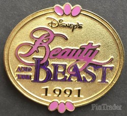 | Pin reads "Walt Disney's Beauty and the Beast 1991". Beauty and the Beast is in pink and purple letters. The background is gold. |