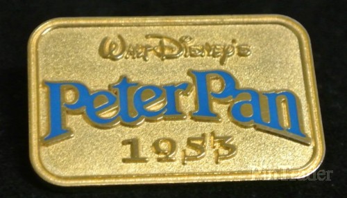 | Pin reads "Walt Disney's Peter Pan 1953". Peter Pan is in bold blue letters and the background is gold. |