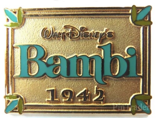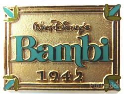 | Pin reads "Walt Disney's Bambi 1942". Bambi is in bold green letters and the background is gold. |