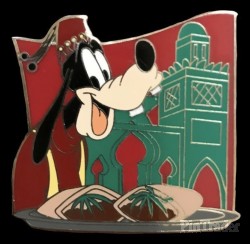 | Goofy is seen wearing a Moroccan hat (fez), against a red background which is supposed to be the flag of Morocco. Food is depicted in front of him, on a platter. Two pins per box. |