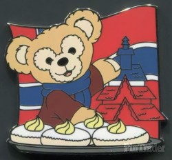 | Duffy is depicted on this pin against a background resembling the Norwegian flag. Norwegian pastries are on a platter in front of him. A stave church is also shown on the pin. Two pins per box. |
