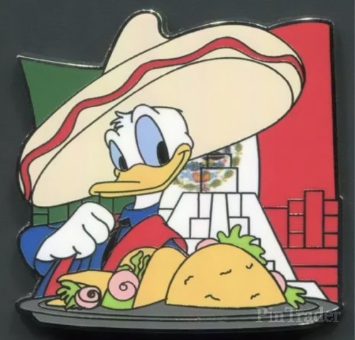 | Donald Duck is depicted wearing a sombrero, against a background resembling the Mexican flag. Three tacos are in front of him. Two pins per box. |