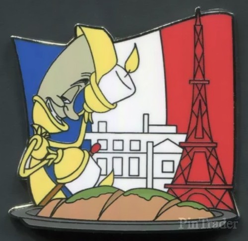 | Lumiere, the candelabra from Walt Disney's "Beauty and the Beast" is pictured in front of the French flag with the Eiffel Tower on the red stripe of the flag. Two pins per box. |