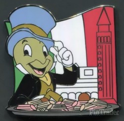 | Jiminy Cricket, from Walt Disney's "Pinocchio", is depicted against a background that is supposed to represent the Italian flag with an Italian building. A dish of penne pasta is in front of Jiminy. Two pins per box. |