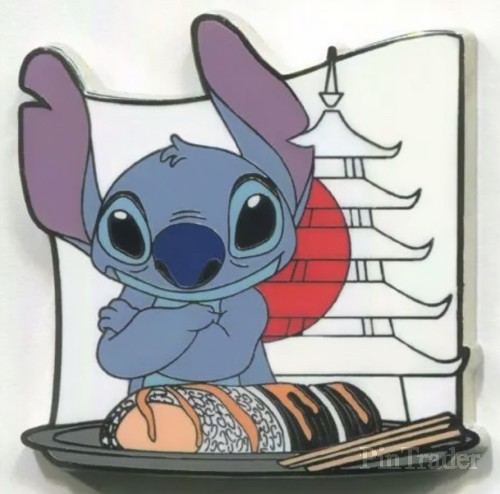 | Stitch from Disney's "Lilo & Stitch" is seen in front of a background resembling the Japanese flag. Sushi is in front of him. A Japanese temple is behind him. Two pins per box. |