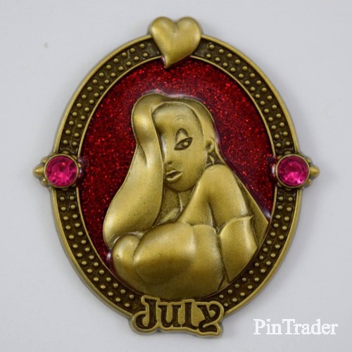 | This open edition pin features Jessica Rabbit from Disney/Spielberg's "Who Framed Roger Rabbit?" It celebrates the birth month of July and features two birthstones surrounding Jessica Rabbit. A heart is on top of the oval shaped pin and the bottom says the month "July." The pin is elegantly wrapped in a gold colored box with pink ribbon. Part of a series of twelve pins, featuring princesses and other female characters from Disney's movies. |