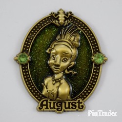 | This open edition pin features Tiana from Disney's "Princess and the Frog." It celebrates the birth month of August and features two birthstones surrounding Tiana. A frog is on top of the oval shaped pin and the bottom says the month "August." The pin is elegantly wrapped in a gold colored box with pink ribbon. Part of a series of twelve pins, featuring princesses and other female characters from Disney's movies. |