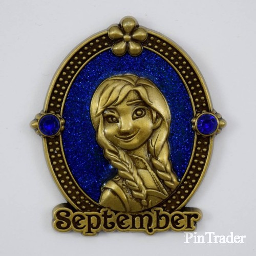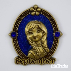 | This open edition pin features Anna from Disney's "Frozen." It celebrates the birth month of September and features two birthstones surrounding Anna. A flower is on top of the oval shaped pin and the bottom says the month "September." The pin is elegantly wrapped in a gold colored box with pink ribbon. Part of a series of twelve pins, featuring princesses and other female characters from Disney's movies. |