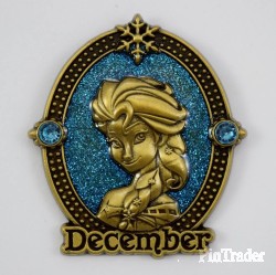 | This open edition pin features Elsa from Disney's "Frozen." It celebrates the birth month of December and features two birthstones surrounding Elsa. A snowflake is on top of the oval shaped pin and the bottom says the month "December." The pin is elegantly wrapped in a gold colored box with pink ribbon. Part of a series of twelve pins, featuring princesses and other female characters from Disney's movies. |
