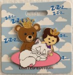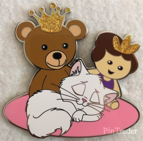 | Jazzy Cat is Charlotte's cat from Disney's "The Princess and the Frog." She is sitting on a pink pillow, surrounded by a teddy bear wearing a crown and a doll, wearing a crown. This pin was sold at the D23 2019 Expo in Anaheim, California at Mickey's of Glendale pop-up shop. |