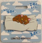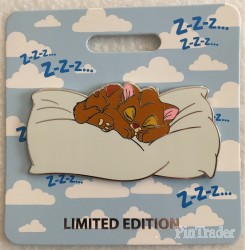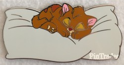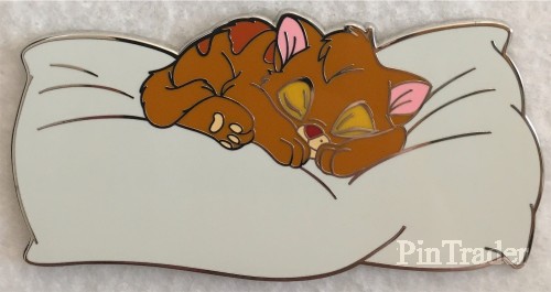 | Oliver is from Walt Disney's "Oliver and Company." He is laying on a fluffy white pillow. This pin was sold at the D23 2019 Expo in Anaheim, California at Mickey's of Glendale pop-up shop. |