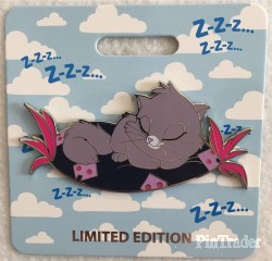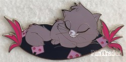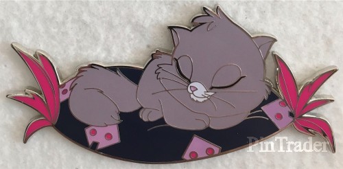 | Yzma the cat is in disguise from Disney's "The Emperor's New Groove." She is laying on a dark blue pillow with pink feathers. This pin was sold at the D23 2019 Expo in Anaheim, California at Mickey's of Glendale pop-up shop. |