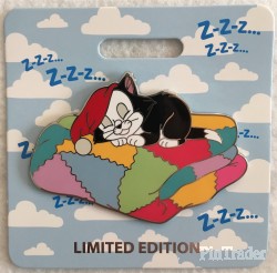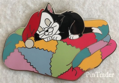 | Figaro is the black and white cat from Walt Disney's "Pinocchio" and a series of shorts with Minnie Mouse. He is wearing a red sleeping cap which resembles Gepetto's sleeping cap and laying on a multi-colored blanket. This pin was sold at the D23 2019 Expo in Anaheim, California at Mickey's of Glendale pop-up shop. |