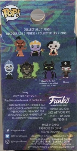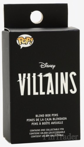 | Description from Box Lunch: Funko Pop! Disney Villains Blind Box Enamel Pin One of your wicked favorites is hidden within these blind boxes! The Disney Villains have been transformed into silver tone enamel Funko Pop! pins. This spellbinding assortment features Scar, Ursula, Cruella de Vil, Maleficent as a dragon, Dr. Facilier, Jafar, and Hades. Which one will you get? It's a surprise! Sorry, no choice or returns. • Each box contains one mystery pin • Approx. 1 1/2" - 2" • Enamel; • metal • Imported Sold at BoxLunch |
