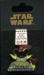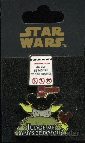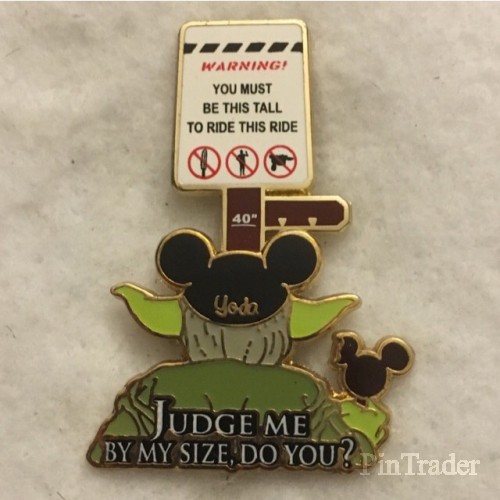 | This pin features Yoda, wearing black Mickey ears with his name etched in gold, and eating a Mickey ice cream bar (there is a bite missing out of Mickey's ear.) Yoda is looking at the height requirement of 40" to ride a ride (presumably Star Tours.) The words "Judge Me By My Size, Do You?" appear on the bottom. |