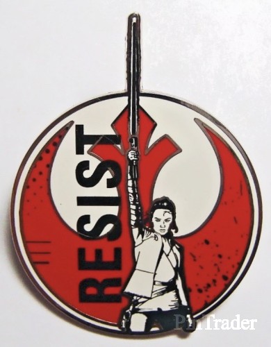 | This pin shows Rey holding her lightsaber with a rebel symbol and the word Resist. |